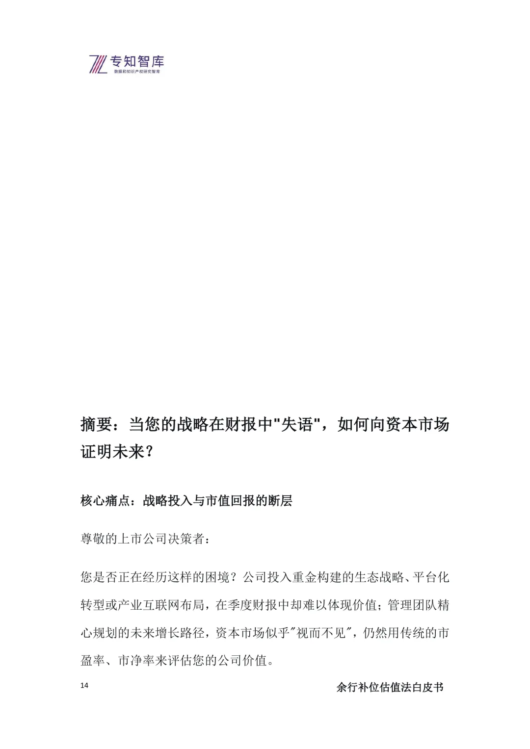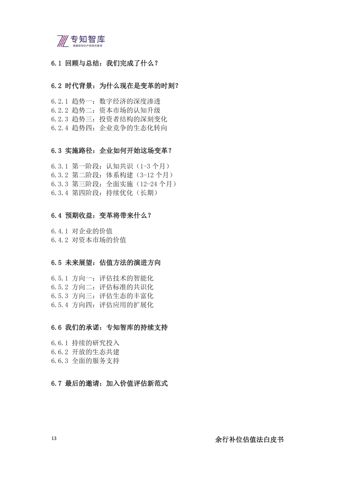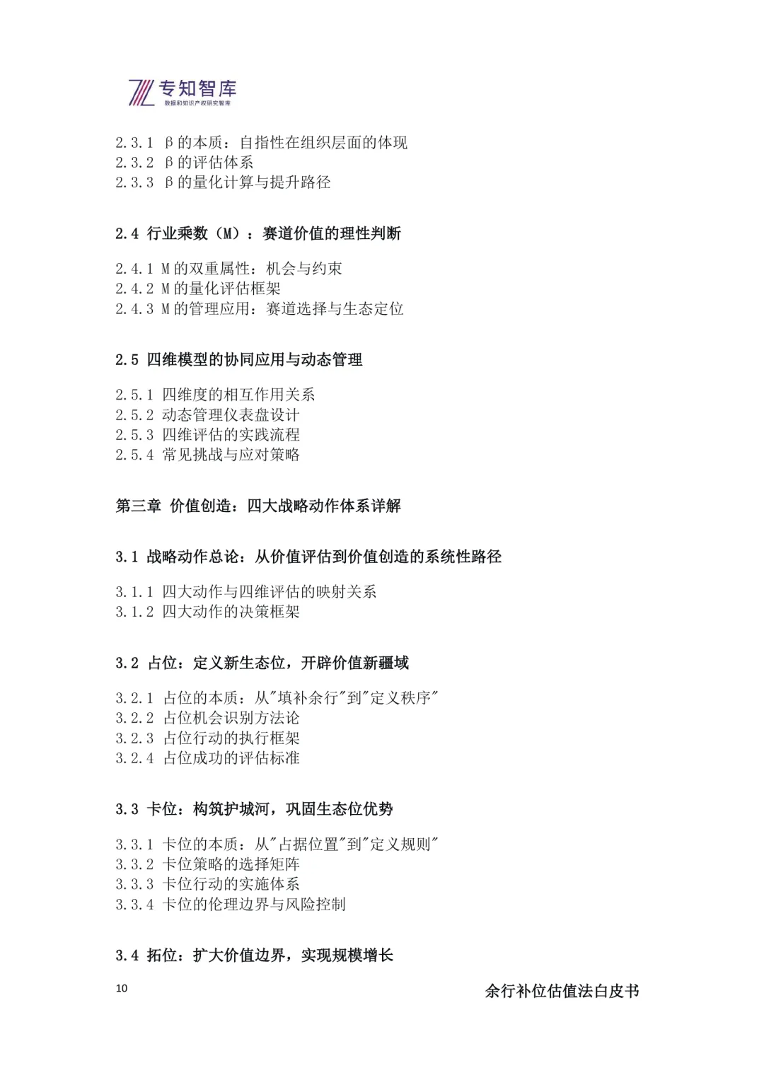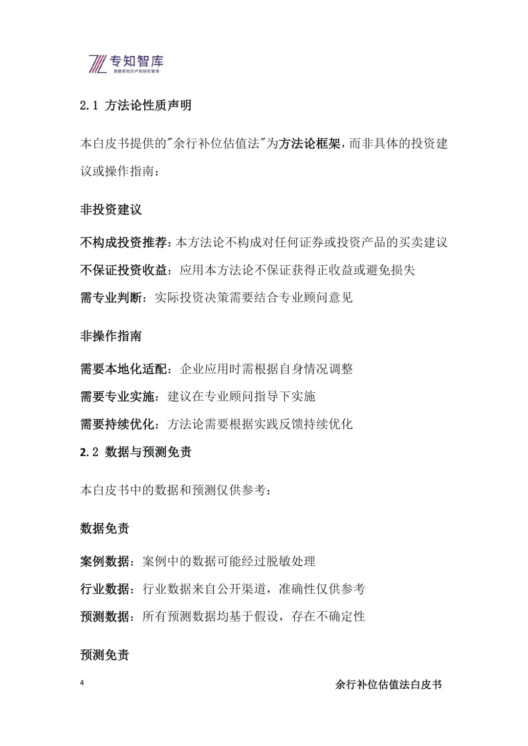 余行补位估值法是一种将企业生态战略转化为市值优势的系统性方法,旨在帮助上市公司管理层实现价值提升。该方法以四个核心维度构建评估模型:R(资源)、λ(链接)、β(反馈)、M(市场),通过量化分析和动态调整,支持企业在复杂市场环境中优化资源配置、增强协同效应,并提升整体竞争力。白皮书强调,该估值法属于方法论框架,不构成投资建议或操作指南,需结合实际情况进行本地化适配。其应用过程中可能面临战略转型、管理变革及外部环境等多方面风险,企业应根据自身条件谨慎实施,并在专业指导下持续优化。内容涵盖理论体系、数据模型、图表工具、案例研究及管理体系,适用于企业内部研讨、学术研究及媒体报道等非商业用途,但需注明来源并保持完整性。如用于商业目的,需向专知智库申请授权。