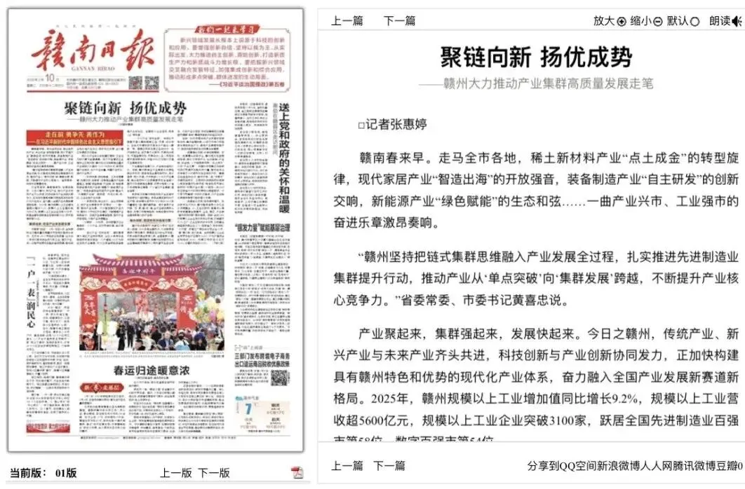 2月9日至10日,国务院总理李强在赣州调研并看望慰问基层干部群众。赣南日报10日头版头条推出配套稿件《聚链向新 扬优成势——赣州大力推动产业集群高质量发展走笔》。该文被省工信厅等多方转载。