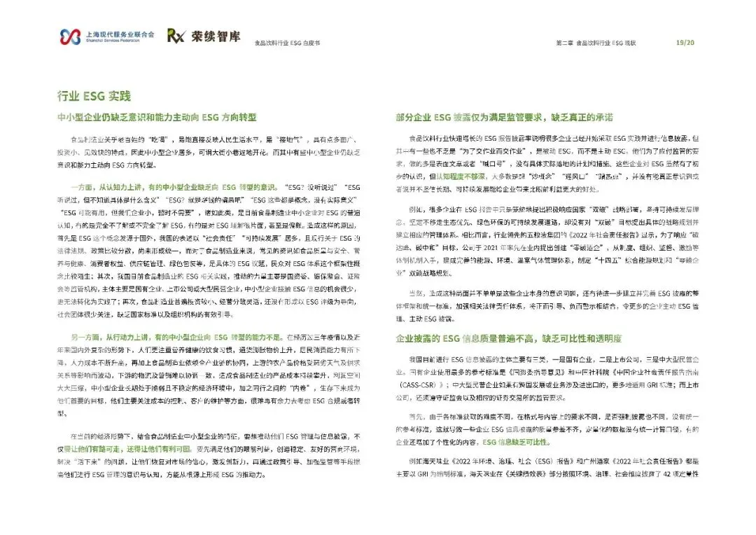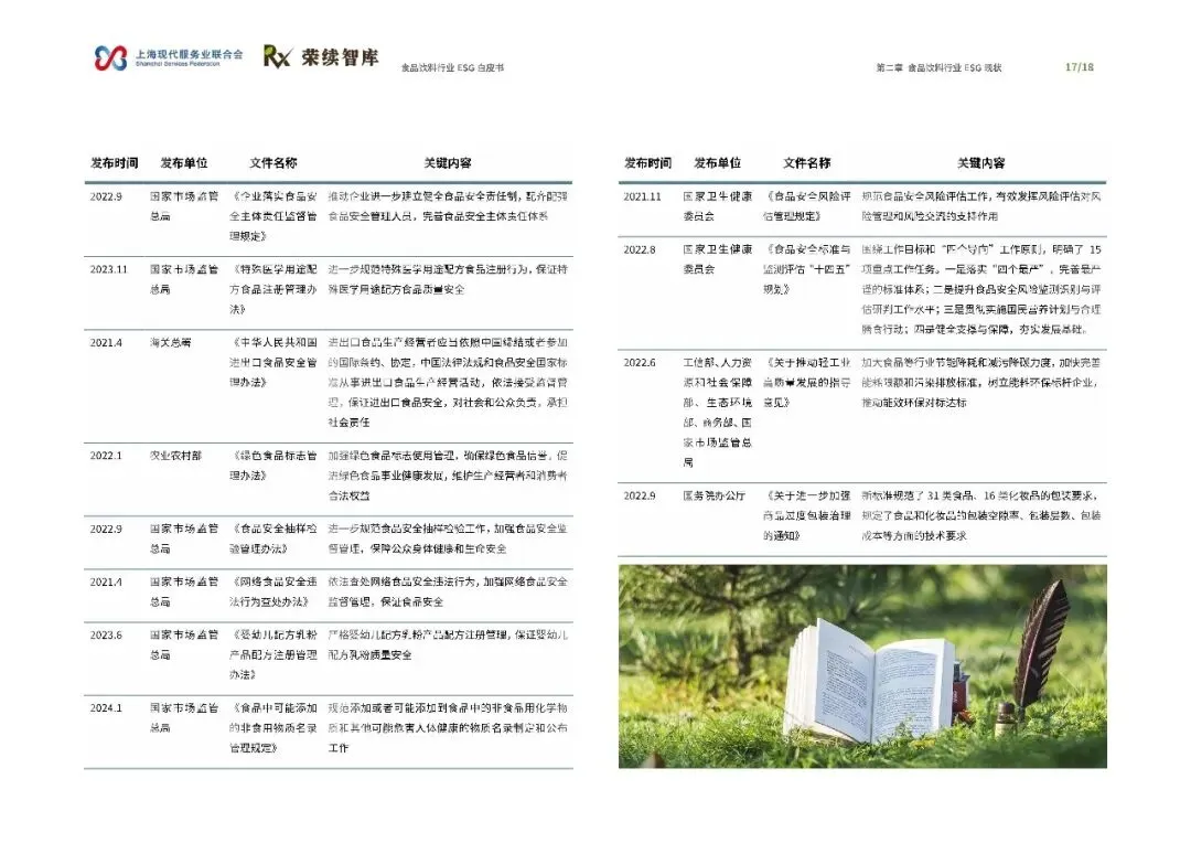 在ESG现状方面,报告指出行业ESG报告披露及评级呈现积极增长,但同时也存在信息披露质量参差不齐、缺乏统一标准等问题。报告通过分析相关政策,展示了国家对食品饮料行业在健康化、安全化、智能化方向的引导和要求。