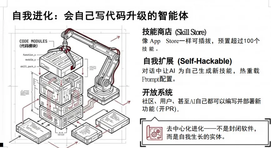 ? 像App Store一样的“技能商店”,预置100+技能。但真正恐怖的是——社区、用户、甚至AI自己都可以编写并部署新功能。