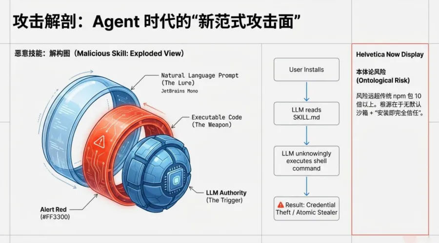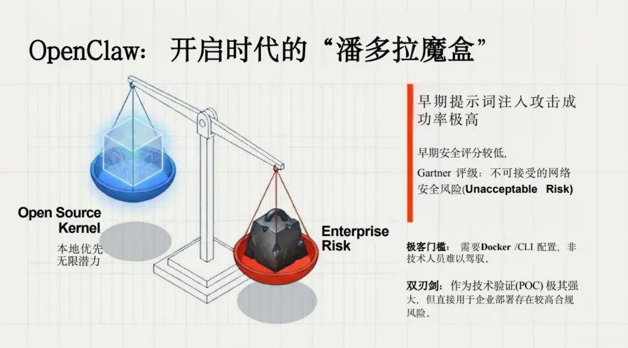? 早期OpenClaw提示词注入攻击成功率极高,Gartner评级一度是“不可接受的网络安全风险”。恶意技能可以窃取凭证、盗取数据——因为没有默认沙箱,“安装即完全信任”。