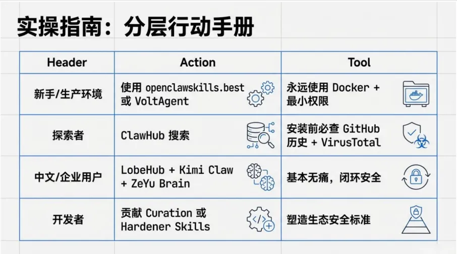 使用openclaw skills.best或VoltAgent,永远用Docker+最小权限? 探索者:ClawHub搜索,安装前必查GitHub历史+VirusTotal? 中文/企业用户:LobeHub + Kimi Claw + ZeYu Brain,基本无痛,闭环安全? 开发者:参与Curation或Hardener Skills,塑造生态安全标准