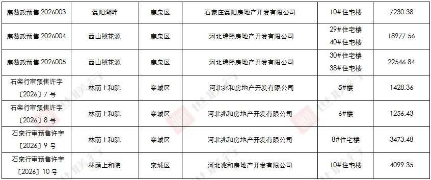 2026年2月,石家庄市行政审批局及各区域政府网站新增预售许可证公示37个,由长安区、桥西区、裕华区、新华区、高新区、鹿泉区、栾城区、藁城区供应。