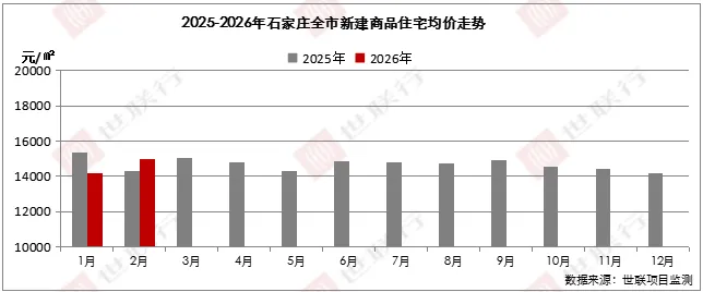 根据世联监测,2026年2月,全市成交均价为14974元/㎡,环比上涨5%,同比上涨4%。