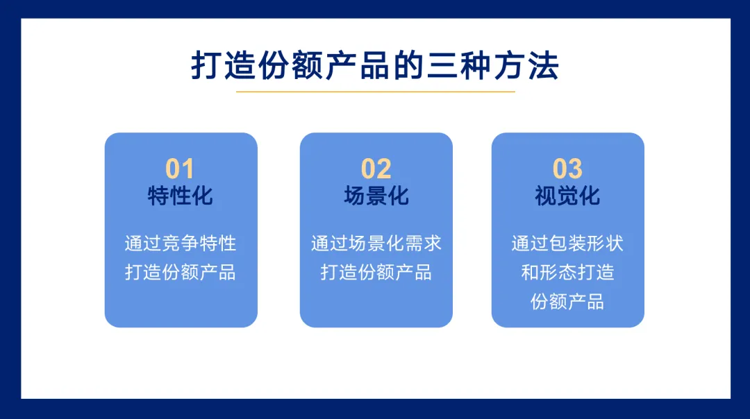 份额产品通常作用于成熟市场,主要是竞争对手都有而且销量还不错的产品,企业为获取市场份额,需要通过场景化、视觉化、特性化等方式实施份额产品的竞争,缺乏份额产品企业存在失去主流市场和被边缘化的竞争风险。