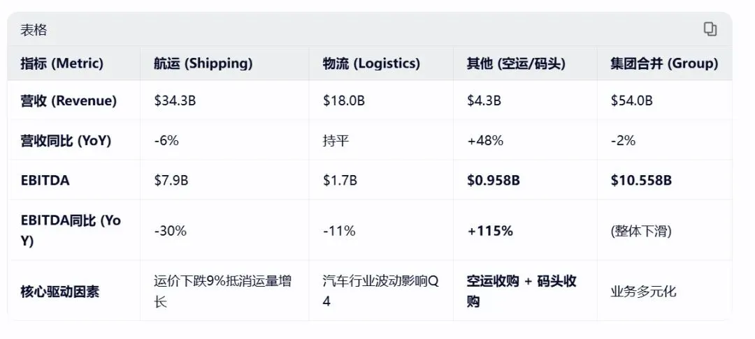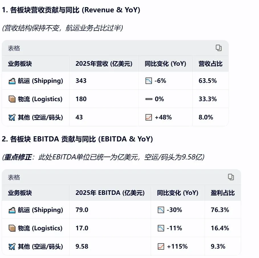 空运/码头的真相:该板块EBITDA为 9.58亿美元(原文$958 million),虽然实现了翻倍增长(+115%),但其绝对贡献值(9.3%)远小于航运业务。它目前是“高增长亮点”,而非“利润核心”。