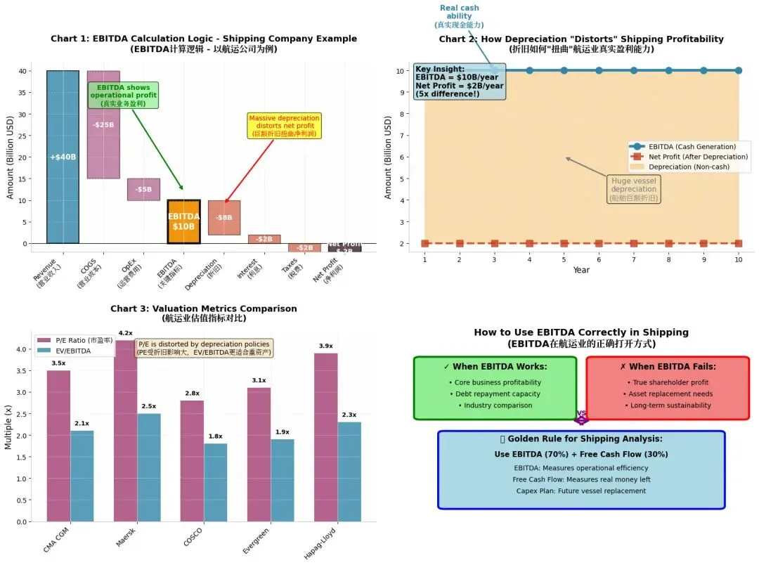 关键洞察:EBITDA ($10B) 是净利润 ($2B) 的5倍!折旧这一非现金支出严重扭曲了表面盈利。