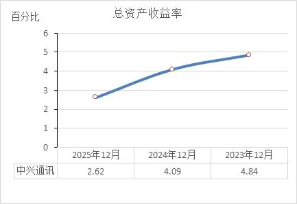 与总资产收益率(4.84%→2.62%)对照看: 杜邦分析告诉我们,ROE = 净利率 × 总资产周转率 × 权益乘数。乘数没变,但ROE崩了,问题全出在前面两个指标(盈利能力+运营效率)上。
