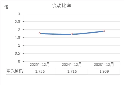短期没风险: 流动比率衡量的是“每1元短期负债,有多少流动资产可以覆盖”。三年都在1.7倍以上,意味着即使所有短期债务同时到期,公司也能拿出1.7倍的钱来还。这在制造业里属于合格水平。