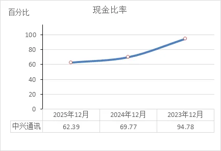 “活钱”严重缩水: 现金比率只看货币资金和交易性金融资产(随时能卖的理财),是最保守的偿债指标。从94.78%跌到62.39%,意味着公司可立即动用的资金,对短期债务的覆盖能力下降了三分之一。
