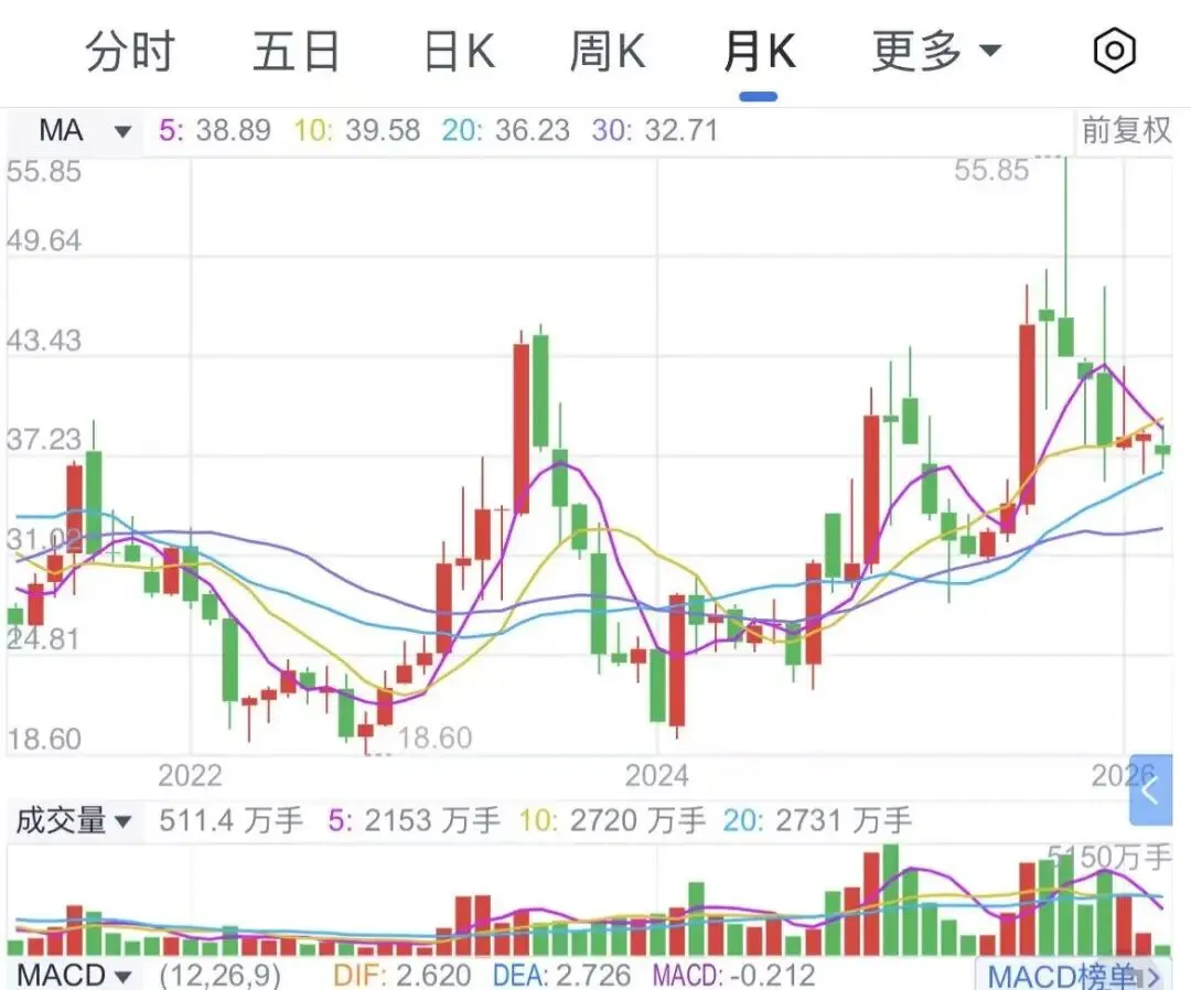 当前股价:37.40元(截至2026年3月8日),近期从55元的高点回落,处于调整阶段。