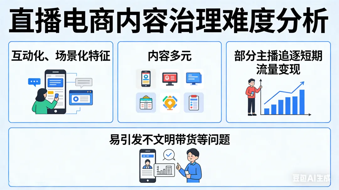 内容治理难度大:直播电商互动化、场景化特征导致内容多元,部分主播追逐短期流量变现,易引发不文明带货等问题。