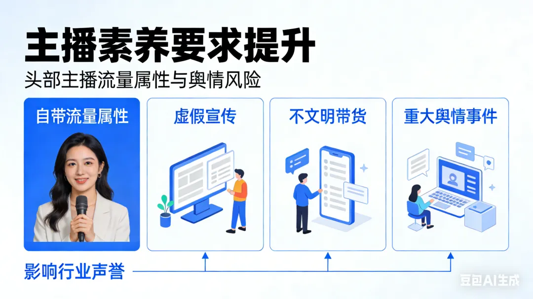主播素养要求提升:头部主播自带流量属性,其虚假宣传、不文明带货等问题易演变为重大舆情事件,影响行业声誉。