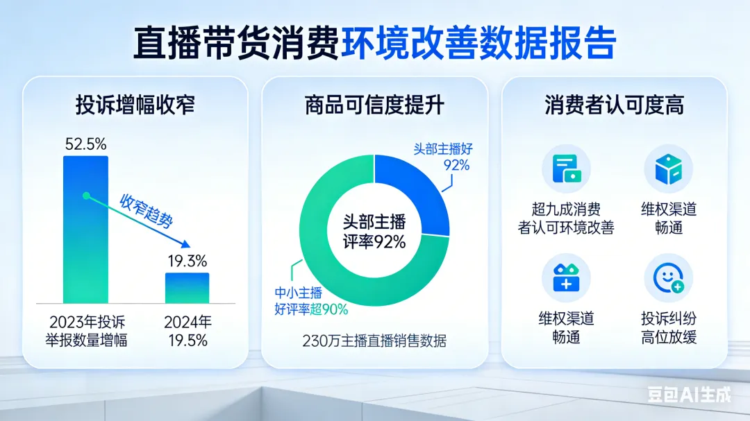 投诉增幅收窄:全国市场监管部门受理的直播带货投诉举报数量增幅,从2023年的52.5%收窄至2024年的19.3%。