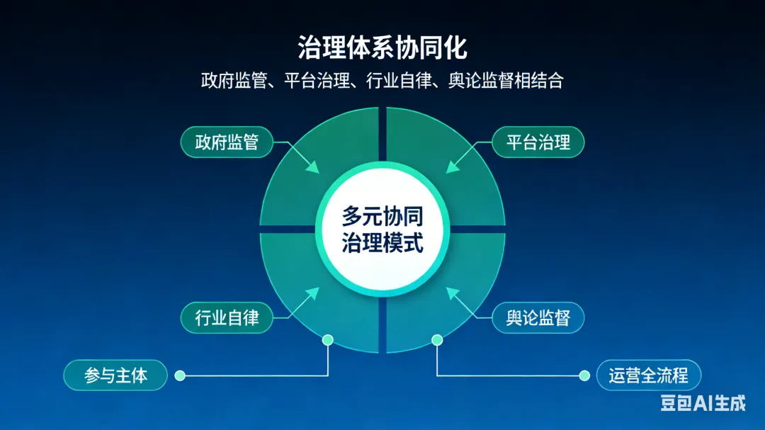 治理体系协同化:构建“政府监管、平台治理、行业自律、舆论监督”相结合的多元协同治理模式,覆盖参与主体及运营全流程。