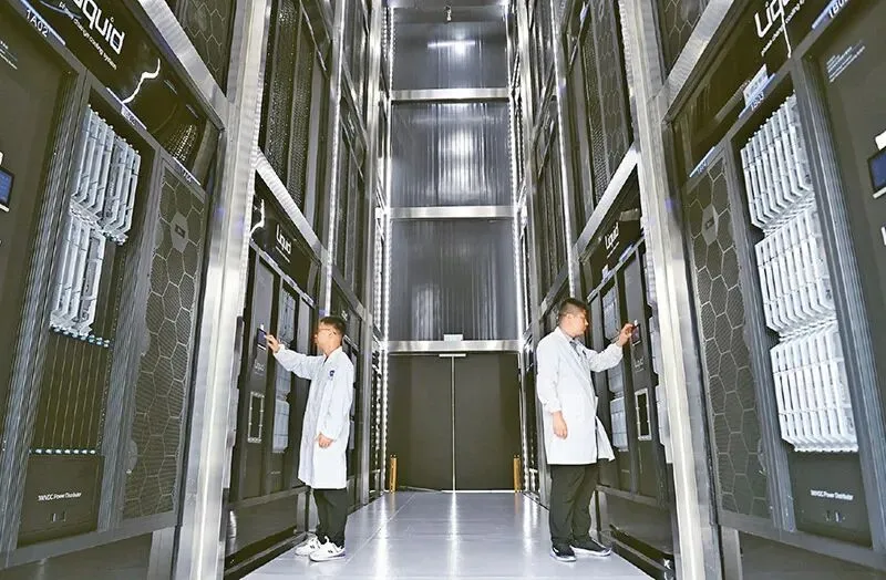 数字产业发展离不开强大算力支撑。“巢湖明月”是合肥综合性国家科学中心重大科技基础设施和公共服务平台,拥有包括科学计算、智能计算、液冷、存储等在内共1500多台服务器。图为2025年4月21日,在安徽合肥高新区的合肥先进计算中心,工作人员在“巢湖明月”机房内检查设备。 中新社记者 韩苏原/摄
