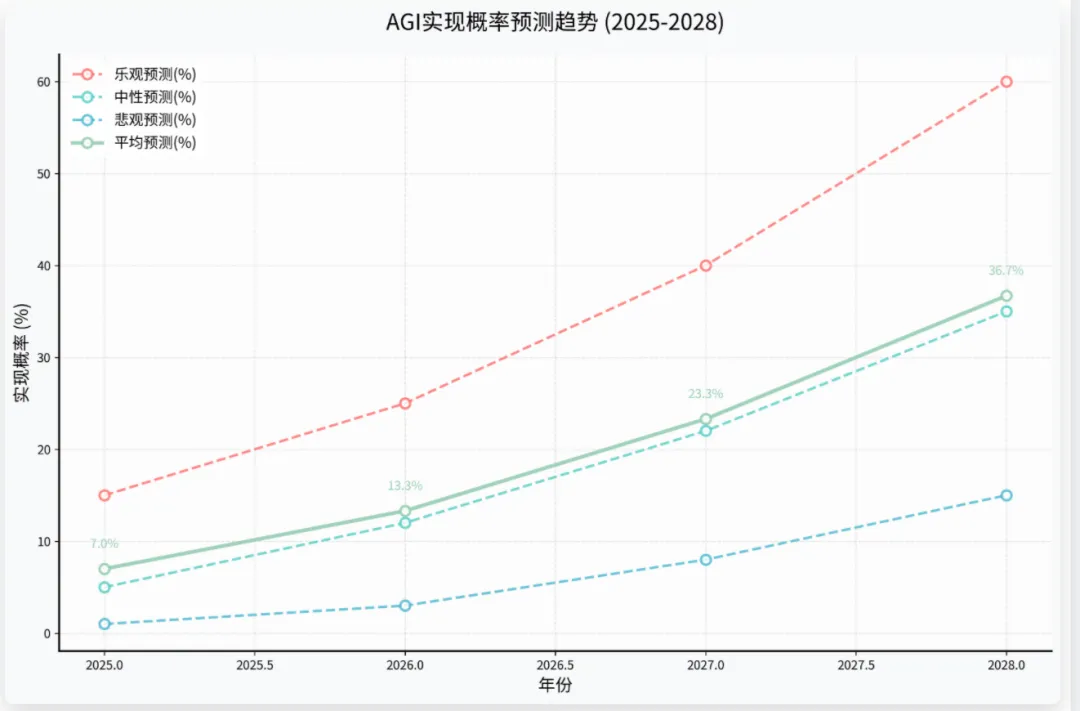 基于乐观、中性、悲观三种情景的AGI实现概率预测,显示2028年平均概率达到36.7%