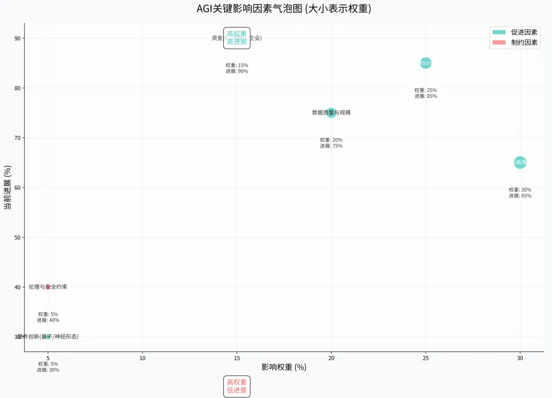 算法突破(权重30%)和算力增长(权重25%)是影响AGI实现的最关键因素,伦理约束是主要制约因素