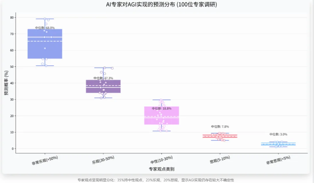 专家观点呈现明显分化:35%持中性观点,23%乐观,20%悲观,显示AGI实现仍存在较大不确定性