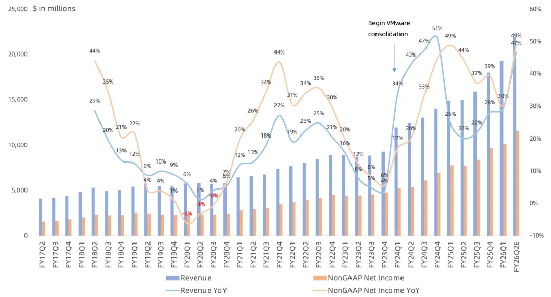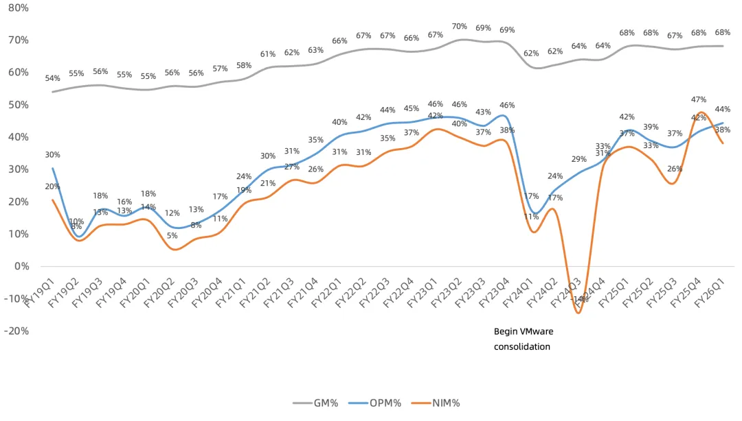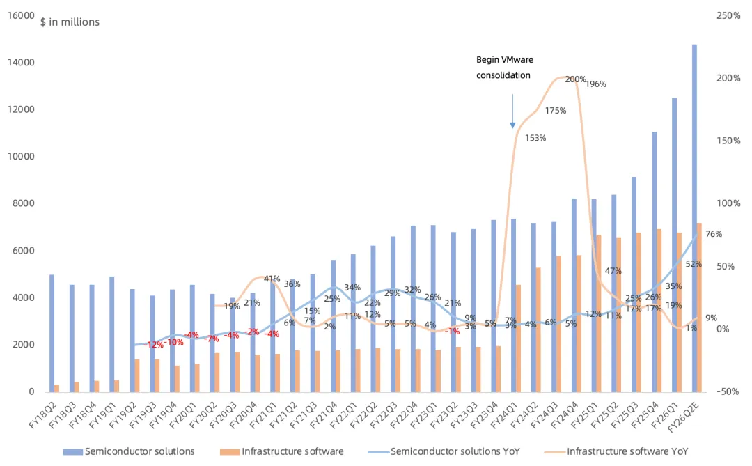以网络、无线、宽带、存储连接、工业、XPU芯片为代表的半导体营收125.2亿美元,同比增长52%,营收占比65%;半导体毛利率68%,同比提升0.3个百分点 ,经营利润率60%,同比提升2.6个百分点;预计FQ2半导体营收148亿美元,同比增长76%; 以VMware、赛门铁克、CA、Brocade为代表软件营收68亿美元,同比增长1%,营收占比35%;软件毛利率93%,经营利润率78%,同比提升1.9个百分点;Vmware本季度营收同比增长13%,TCV 92亿美元,环比下降12亿美元;至于市场担忧的AI吞噬软件,管理层明确表示博通的基础设施软件业务没有被AI取代或冲击,VCF不可能被绕开,也不可能被替代,生成式AI和Agentic AI的增长会刺激更多VMware需求;预计FQ2软件营收72亿美元,同比增长9%;(VMware营收规模自FY25Q1以来不再披露)