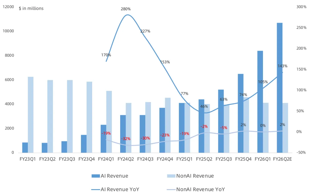 半导体非AI营收41亿美元,同比持平;企业网络、宽带、服务器存储业务同比增长,但被无线业务的季节性下滑所抵消;