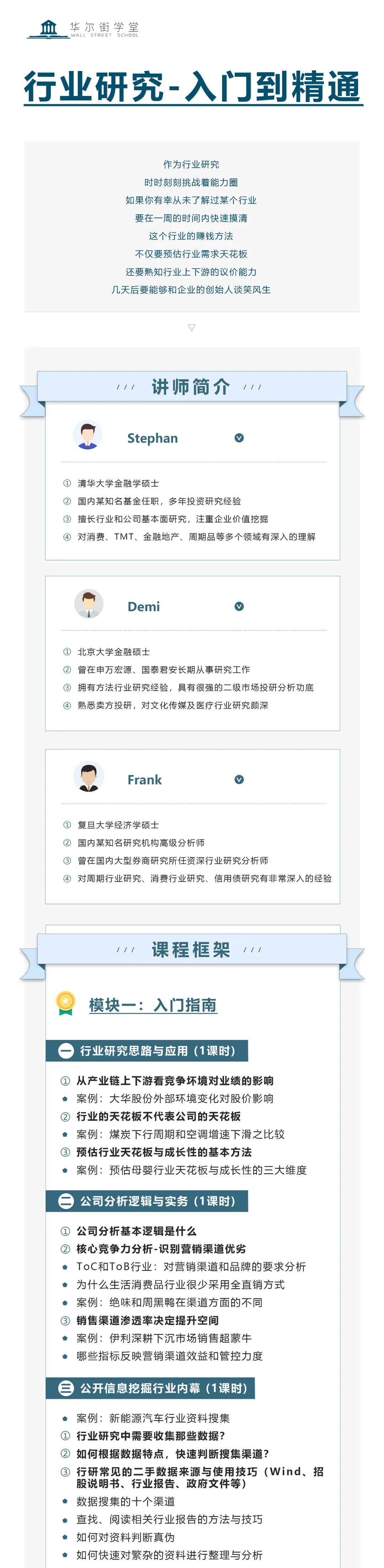 为帮助大家充分了解行业研究与公司分析的实务框架和典型案例,有效提高投研判断的能力,华尔街学堂将课程升级成为最全面最系统最精品的《行业研究-入门到精通》专题课(全网最佳、没有之一)
