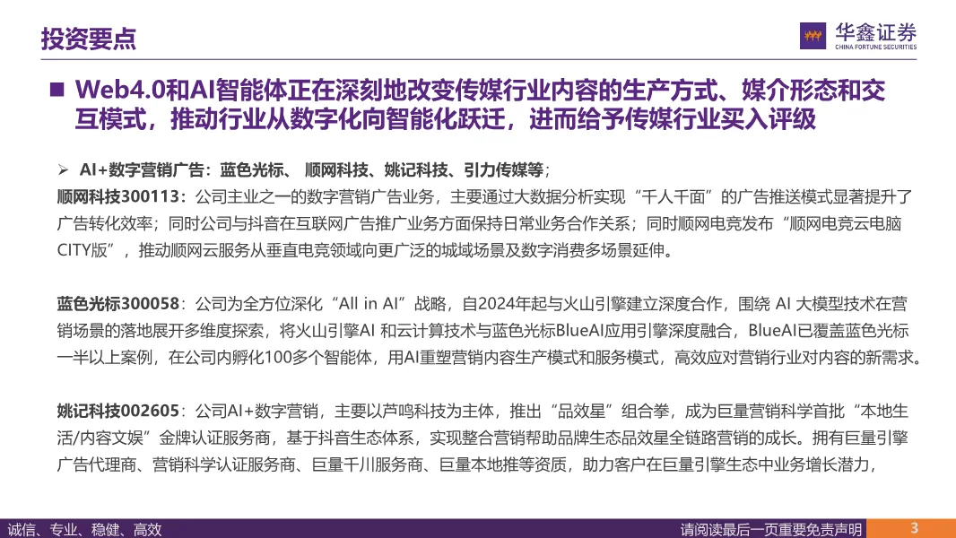 同时报告也明确给出传媒行业买入评级,梳理了数字营销、AIGC 内容、体验经济三大赛道的核心标的,也分析了 MiniMax 等 AI 新势力公司的发展潜力?。