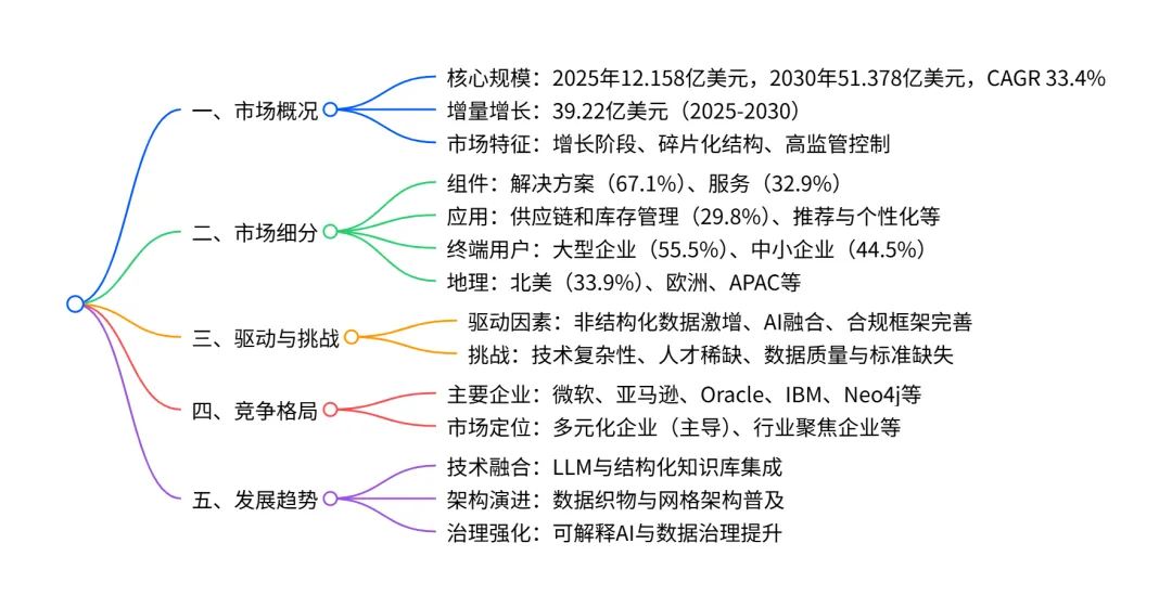 全球企业知识图谱市场在 2025-2030 年将呈现高速增长态势,2025 年市场规模为 12.158 亿美元,预计 2030 年达到 51.378 亿美元,CAGR 高达 33.4%,增量增长 39.22 亿美元;市场以解决方案(占比 67.1%) 为主要组件,供应链和库存管理是核心应用领域,大型企业为主要终端用户,北美是最大区域市场,而APAC是增长最快区域;驱动因素包括非结构化数据激增、生成式 AI 与检索增强生成的融合、监管合规框架完善,同时面临技术复杂性、专业人才稀缺等挑战,市场竞争呈现碎片化特征,微软、亚马逊、Oracle 等企业为主要参与者。