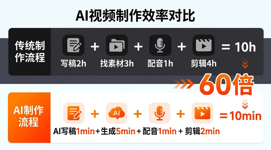 AI写稿(1分钟)→ AI生成素材(5分钟)→ AI配音(1分钟)→ AI剪辑(2分钟)