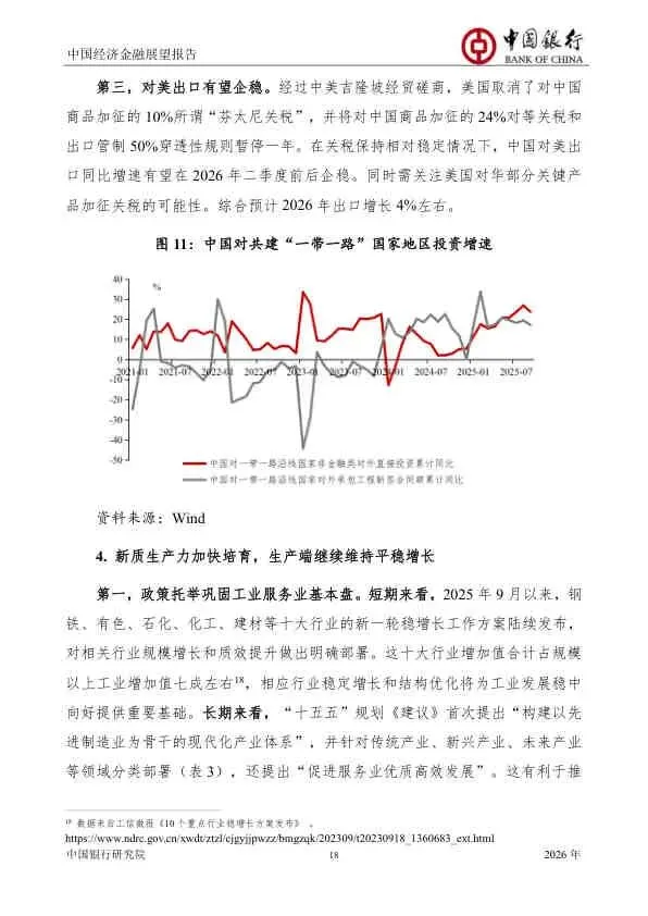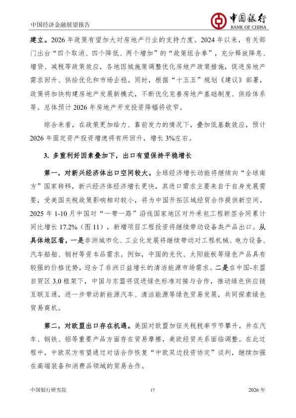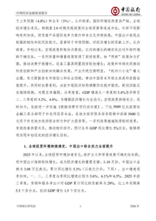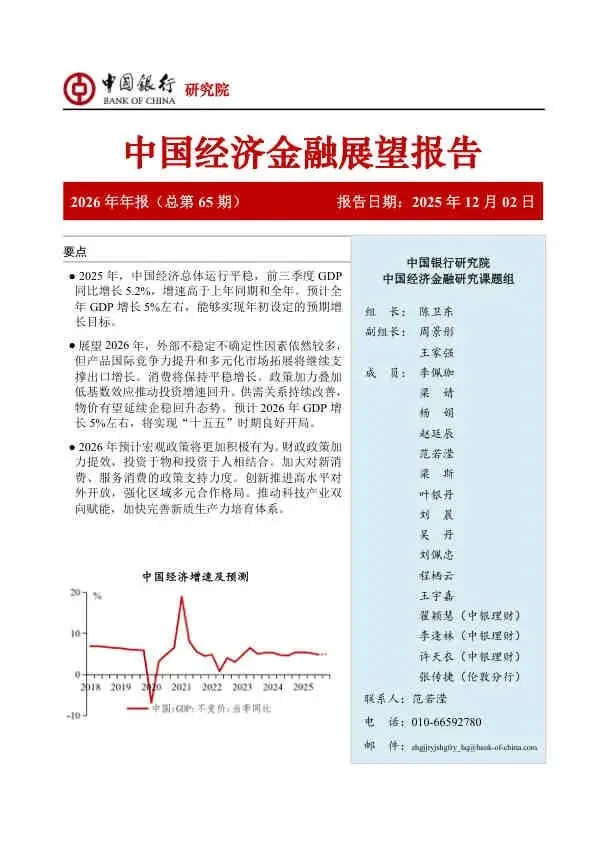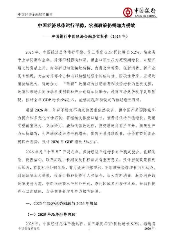 该报告对2026年中国经济持审慎乐观态度。它强调,在复杂严峻的内外环境下,中国经济的韧性和潜力依然巨大。成功的关键在于能否有效落实“更加给力”的宏观政策,精准施策以激发内生增长动力,同时牢牢把握住以科技创新为核心的新质生产力发展机遇,确保“十五五”开好局、起好步。
