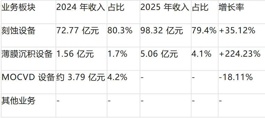 刻蚀设备是中微公司的核心业务支柱,2025 年销售收入约 98.32 亿元,占总营收比重超 79%。公司在该领域已发展成为全球第四大刻蚀设备供应商,国内市场份额超过 50%。