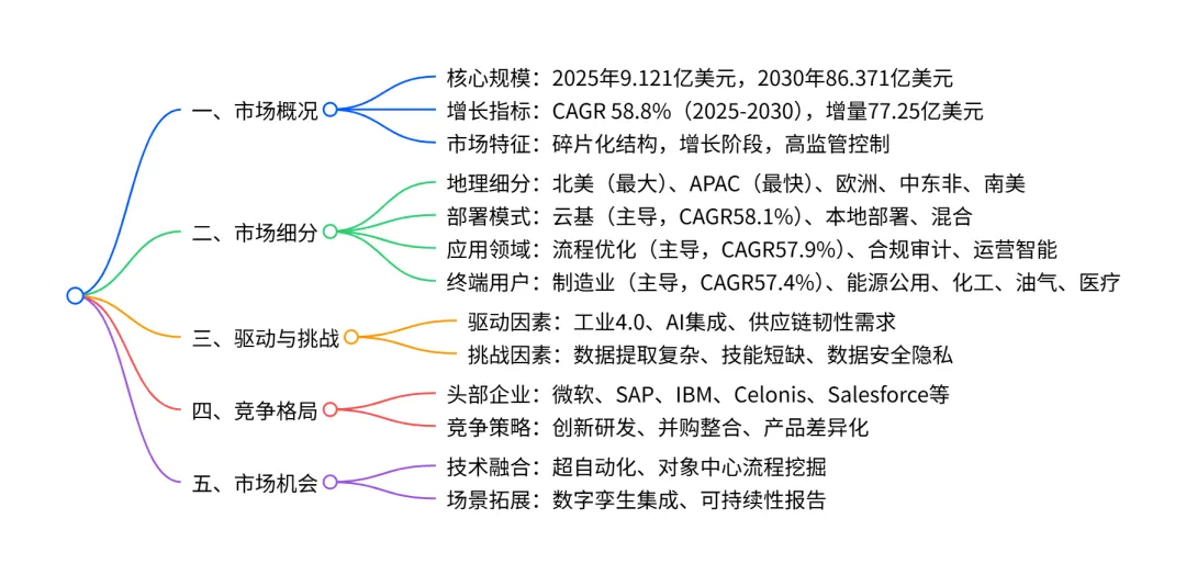 全球工业流程挖掘软件市场正处于高速增长阶段,2025 年市场规模达 9.121 亿美元,预计 2030 年将增至 86.371 亿美元,2025-2030 年复合年增长率达 56.8%,增量增长 77.25 亿美元;市场呈现碎片化结构,北美为最大区域市场(2030 年占比 32.0%),APAC为增长最快区域(CAGR 58.3%);部署模式上云基部署占主导且增长最快(CAGR 58.1%),应用领域以流程优化与效率提升为核心(2030 年占比 67.9%),终端用户中制造业需求最高(CAGR 57.4%);市场驱动因素包括工业 4.0 加速落地、AI 与预测分析集成等,同时面临数据提取复杂性、技能人才短缺等挑战,竞争格局由微软、SAP、IBM 等巨头及 Celonis 等专业厂商主导,创新与并购为主要竞争策略。