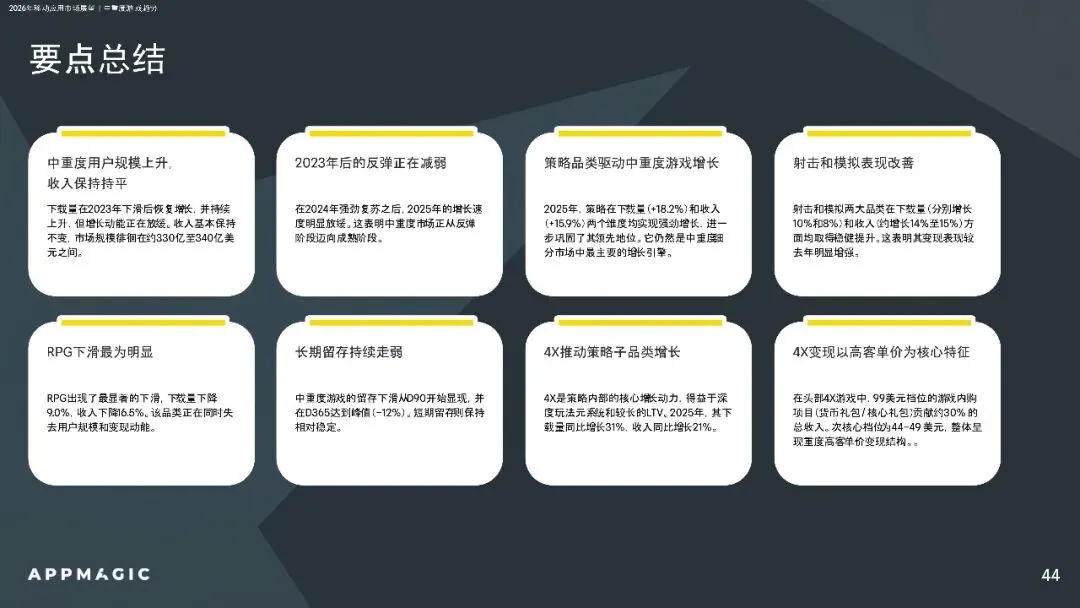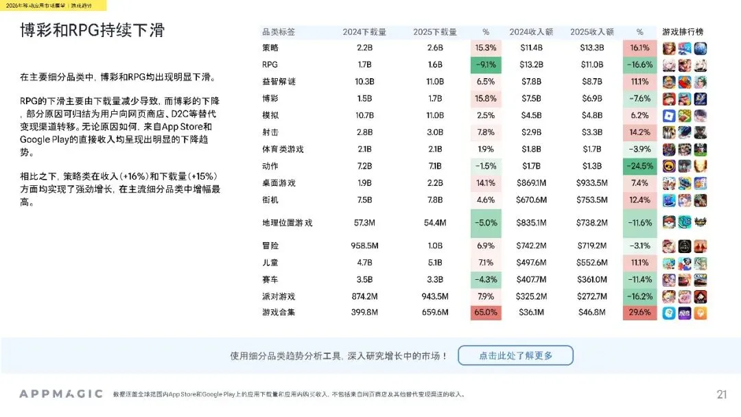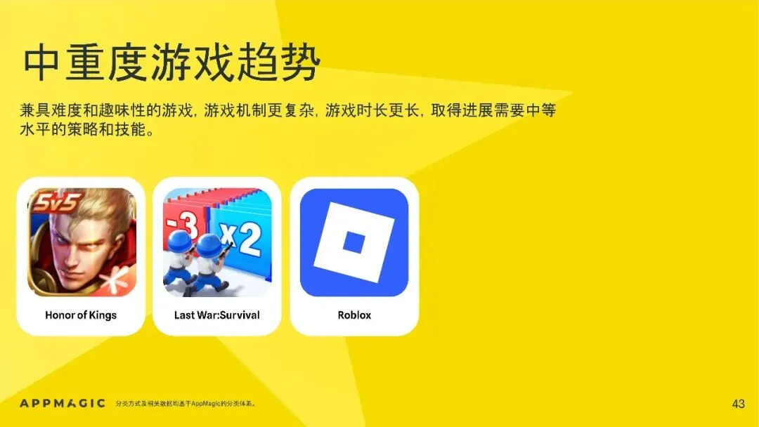 细分市场中,休闲游戏增长动能减弱,中重度游戏依赖策略品类驱动,超休闲游戏向混合化转型。