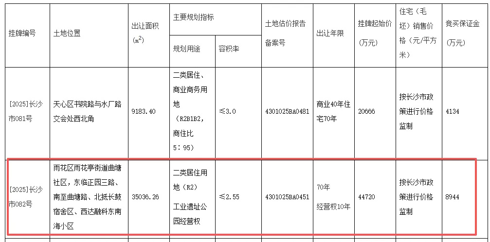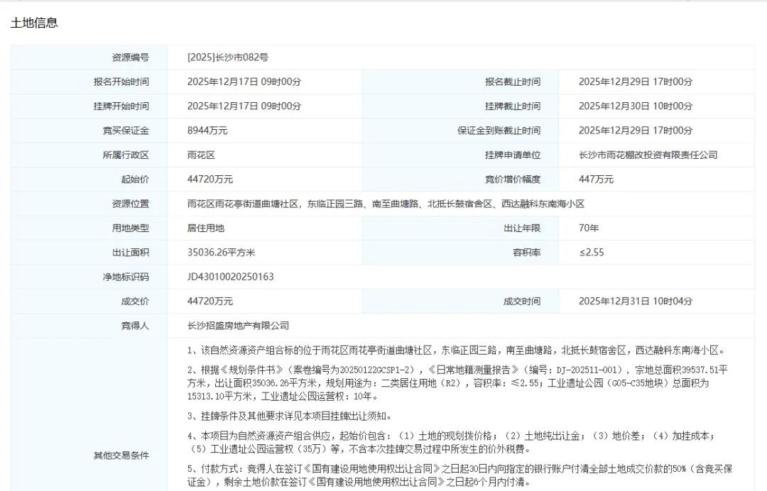 2025年12月30日,[2025]长沙市082号地块成功出让。宗地出让面积35036.26平方米,容积率≤2.55,由长沙招盛房地产有限公司(招商蛇口旗下全资公司)以44720万元底价竞得,折合楼面价5005元/平方米。