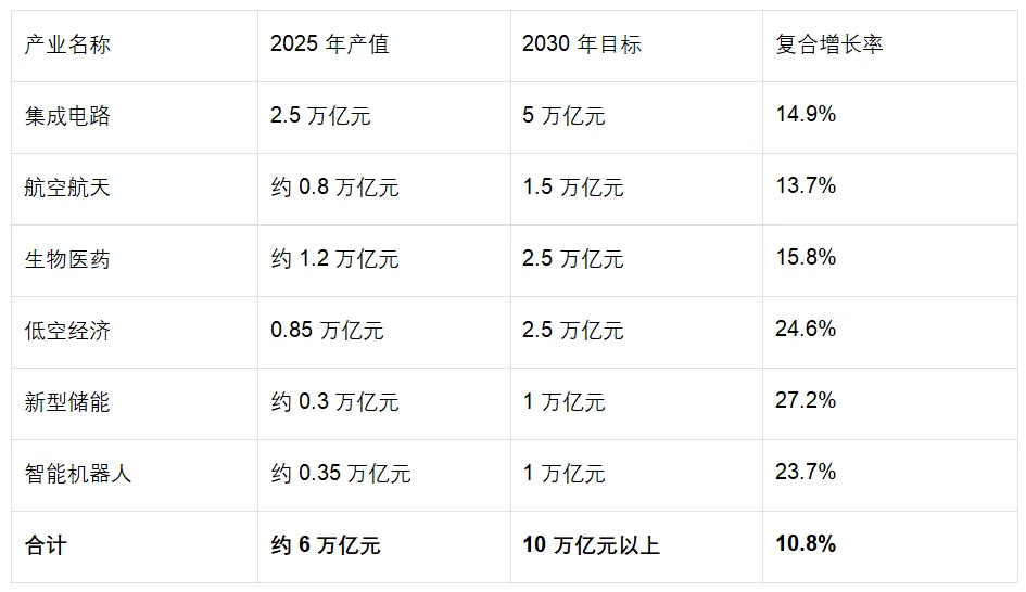 2026 年 3 月 6 日,国家发展改革委主任郑栅洁在十四届全国人大四次会议经济主题记者会上明确表示,将重点打造六大新兴支柱产业:集成电路、航空航天、生物医药、低空经济、新型储能、智能机器人。根据初步测算,这六大产业相关产值在 2025 年已接近 6 万亿元,到 2030 年有望再翻一番甚至更多,扩大到 10 万亿元以上。