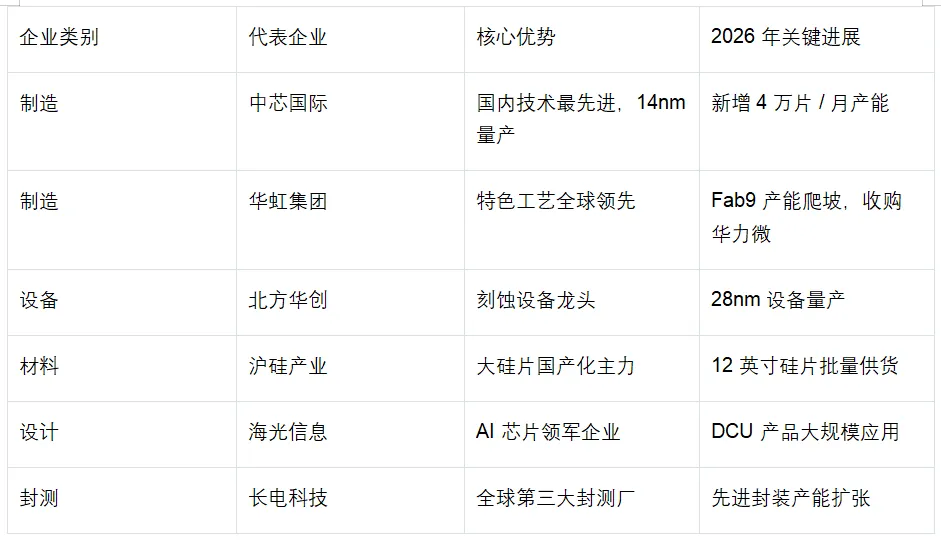 • 制造环节:中芯国际(688981),2026 年新增 4 万片 / 月产能,14nm 及以下先进制程持续突破