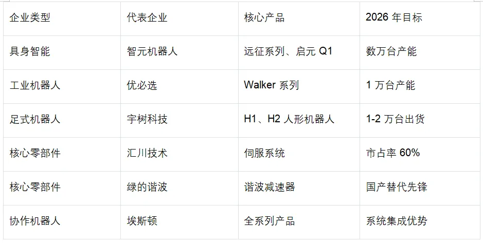 智能机器人:具身智能技术成熟,成本大幅下降,2026 年被定义为量产元年。头部企业如智元机器人、优必选等订单饱满,产能快速扩张,建议积极配置。
