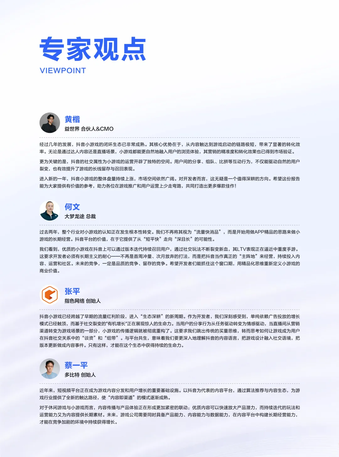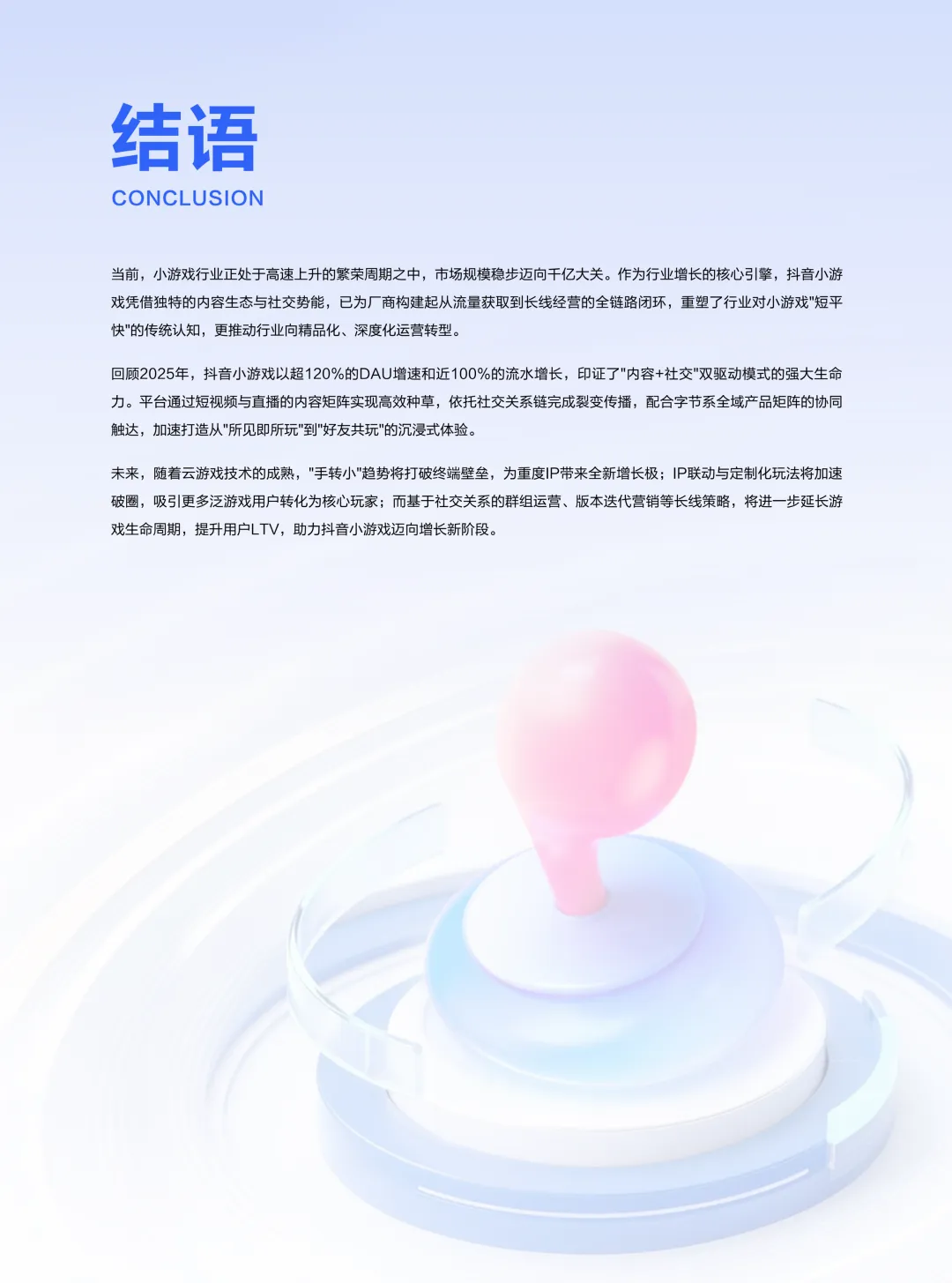 总体来看,小游戏行业正逐步迈入加速发展的新阶段,玩法及品类日趋丰富、玩家社交/互动意愿增强。未来,如何围绕抖音小游戏生态实现营销侧的长线运营和持续获客,是小游戏企业于行业脱颖而出的关键。