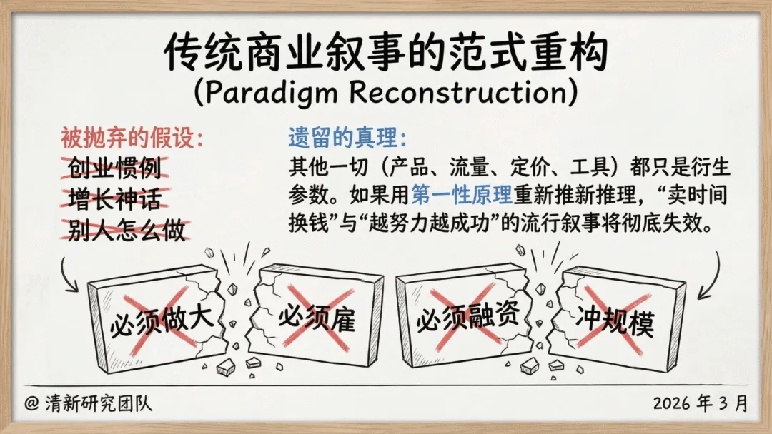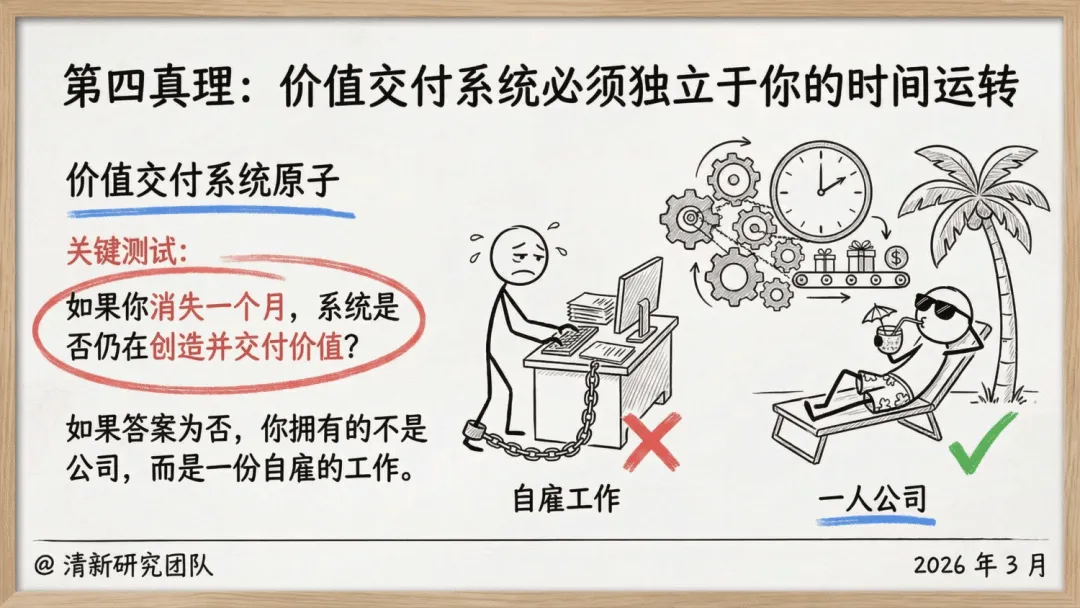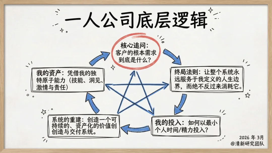 报告提出五大核心真理,奠定一人公司的理论基础:个人的时间、精力等是唯一稀缺资源;商业本质是精简的价值捕获回路,摒弃扩张执念;无团队模式的关键是产品化、自动化等极度杠杆化;价值交付系统需脱离个人时间独立运转,否则只是自雇工作;增长是可选项,追求利润与生活质量的双重最优解,而非盲目扩张。