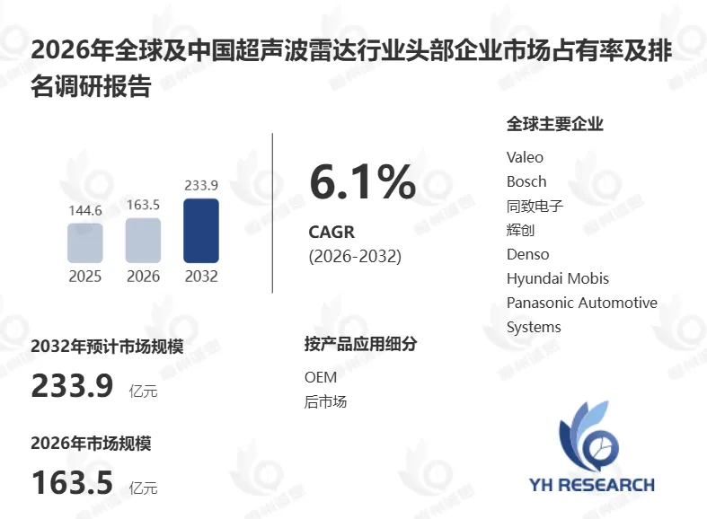 根据YH恒州诚思信息咨询调研统计,2025年全球超声波雷达市场规模约144.6亿元,预计未来将持续保持平稳增长的态势,到2032年市场规模将接近233.9亿元,未来六年CAGR为6.1%。