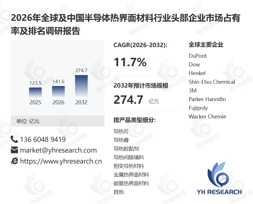 根据YH恒州诚思信息咨询调研统计,2025年全球半导体热界面材料市场规模约123.5亿元,预计未来将持续保持平稳增长的态势,到2032年市场规模将接近274.6亿元,未来六年CAGR为11.7%。