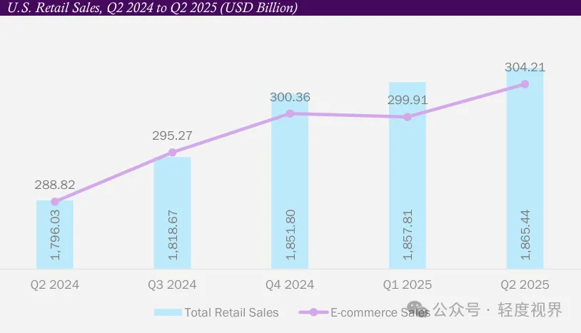 [图表二]美国零售及电商销售额季度趋势(2024年Q2–2025年Q2,USD Billion): 电商销售额增速持续跑赢整体零售,为模塑纤维电商包装需求提供直接支撑。