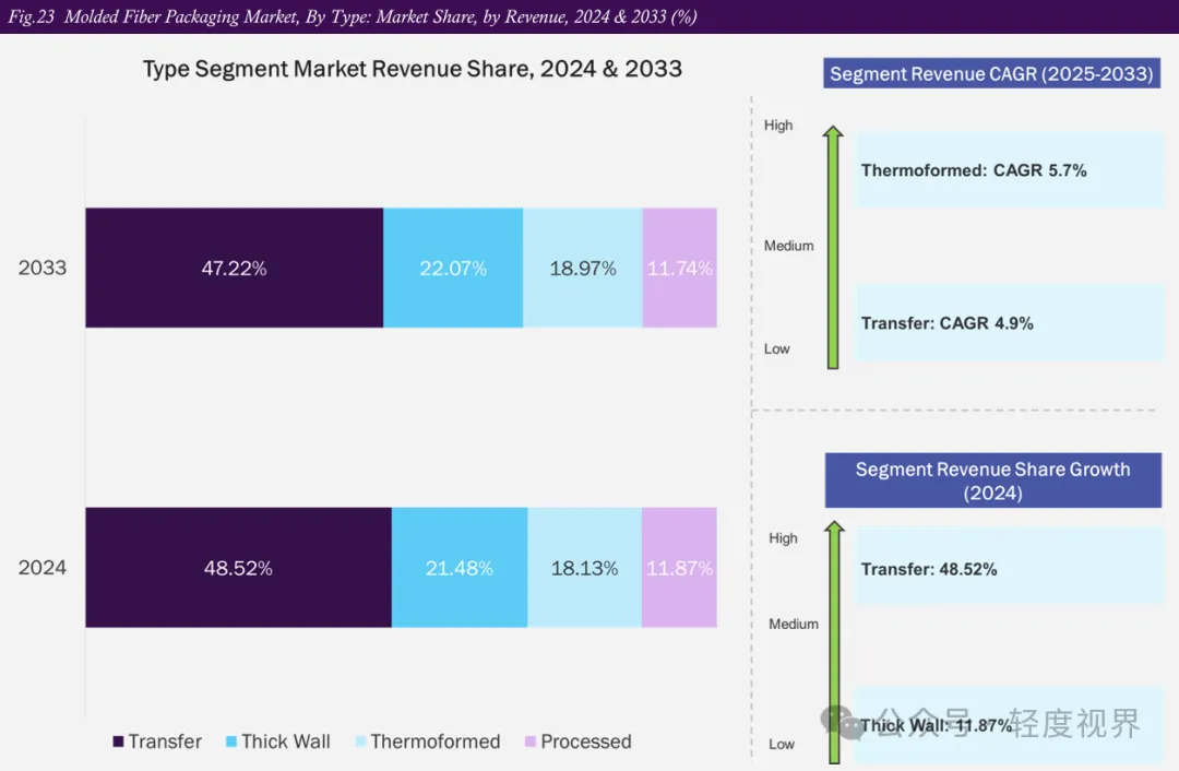 [图表四]模塑纤维包装市场按工艺类型收入份额(2024年 vs 2033年,%): 热成型份额从2024年到2033年出现明显爬升,工艺升级趋势已经确立。
