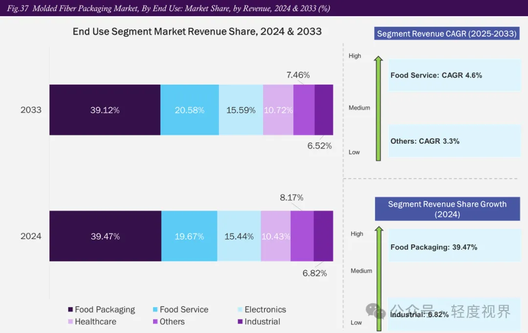 [图表五]模塑纤维包装市场按终端应用收入预测(2021–2033年,USD Million): 食品包装体量最大,餐饮服务增速最快,电子与医疗成为潜力溢价赛道。
