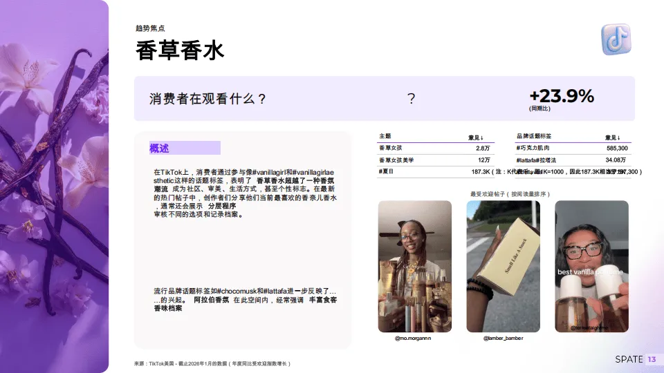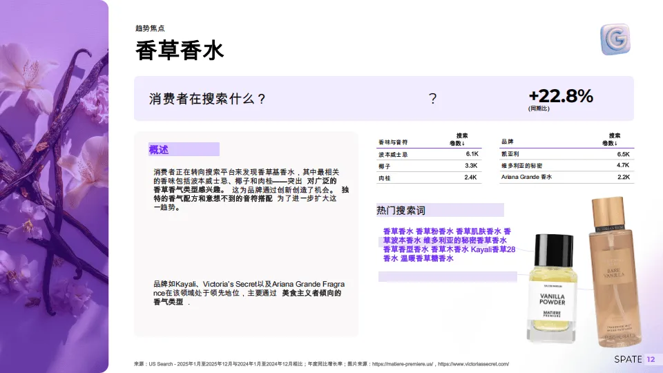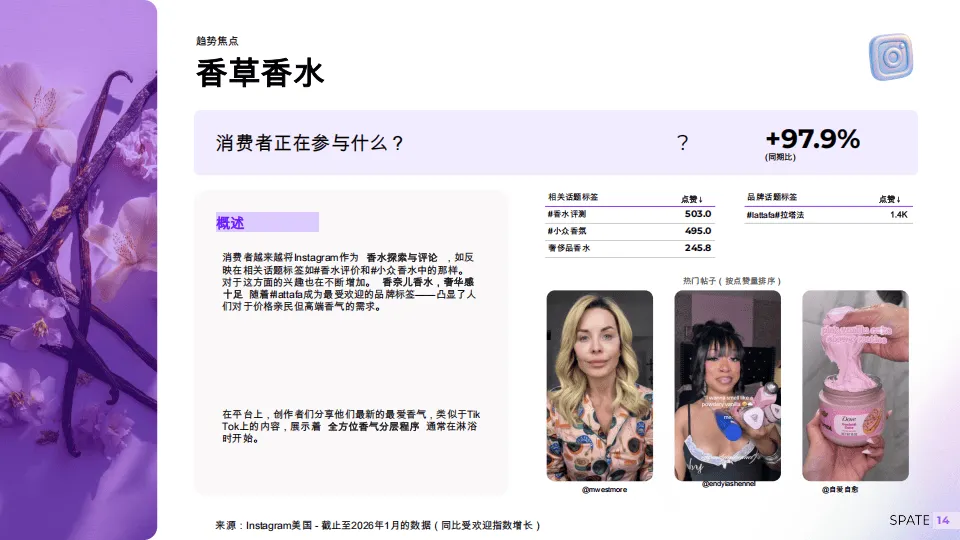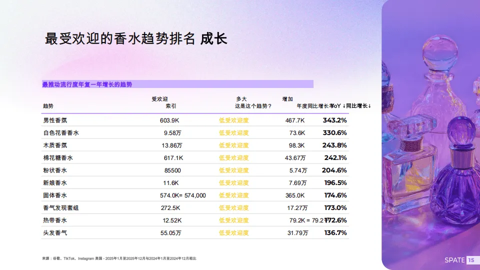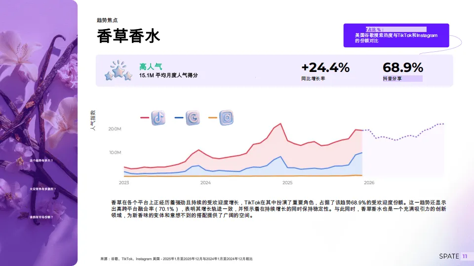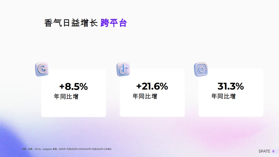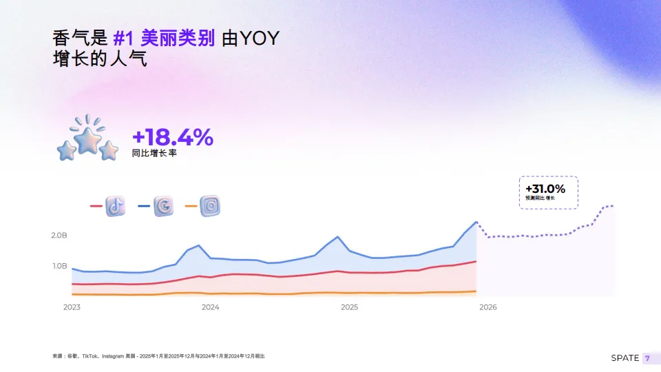《2026年香氛报告》依托Spate跨平台数据,分析了谷歌、TikTok、Instagram超9000亿搜索信号及海量社媒内容,揭示2026年美国香氛市场线上化主导的发展趋势,香氛已成为消费者自我表达的载体,而非单纯商品,且该品类成美妆领域同比增长榜首,2025年同比增18.4%,2026年预测增31.0%,各平台均实现增长。
