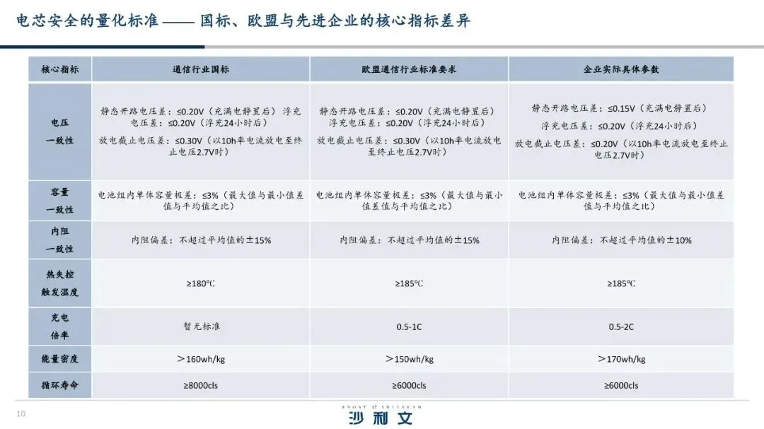 | 参数 | 通信行业国标 | 欧盟标准 | 企业实际参数 | |------|--------------|----------|----------------| | 电压一致性 | 静态开路电压差 ≤0.20V | 静态开路电压差 ≤0.20V | 静态开路电压差 ≤0.15V | | 容量一致性 | 单体容量极差 ≤3% | 单体容量极差 ≤3% | 单体容量极差 ≤3% | | 内阻一致性 | 内阻偏差 ≤±15% | 内阻偏差 ≤±15% | 内阻偏差 ≤±10% | | 热失控触发温度 | ≥180°C | ≥185°C | ≥185°C | | 充电倍率 | 无标准 | 0.5-1C | 0.5-2C | | 能量密度 | >160Wh/kg | >150Wh/kg | >170Wh/kg | | 循环寿命 | ≥8000次 | ≥6000次 | ≥6000次 |系统安全等级