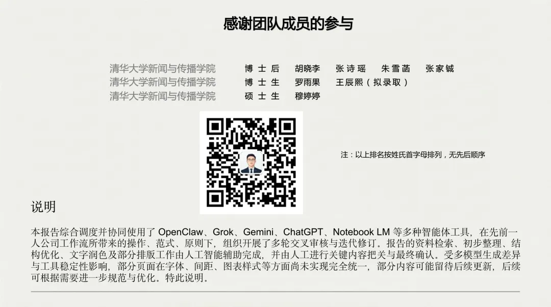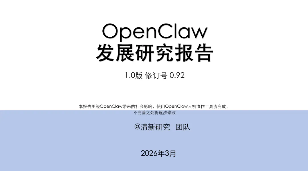 这份由清华大学清新研究团队于2026年3月发布的《OpenClaw发展研究报告(1.0版)》,是一份系统、前瞻且具有哲学深度的技术生态分析文档。报告围绕开源项目OpenClaw展开,全面梳理了其在技术架构、能力演进、安全挑战、生态格局与商业模式等方面的现状与未来趋势。