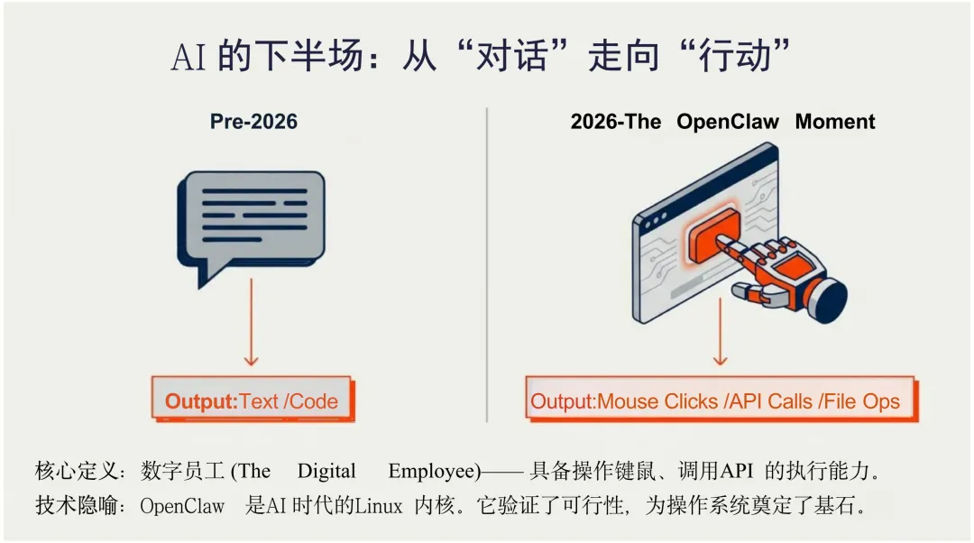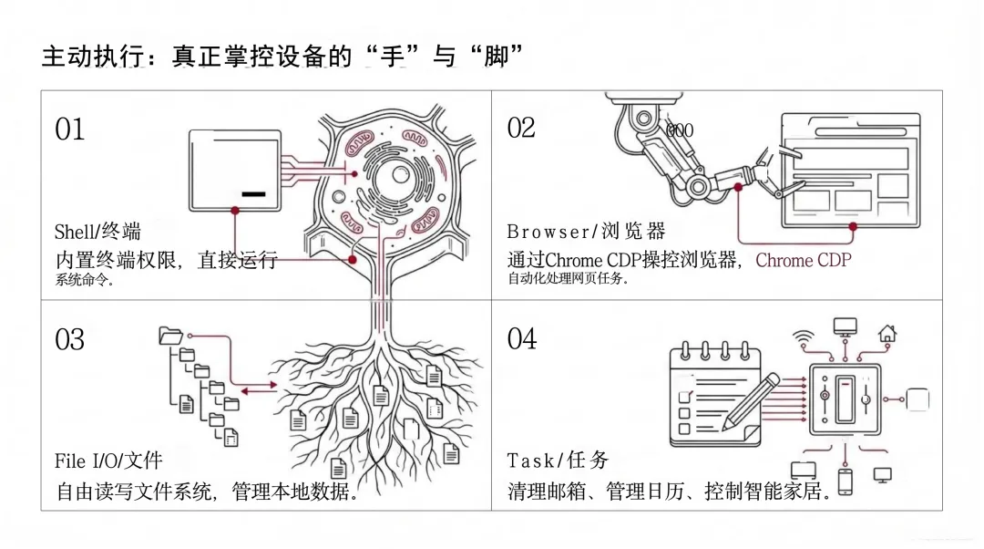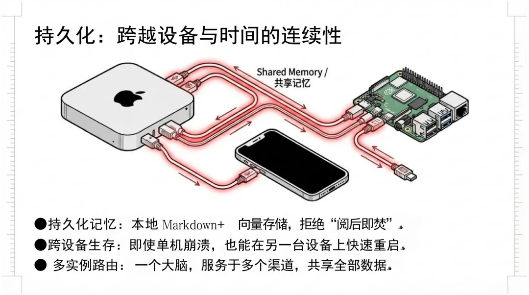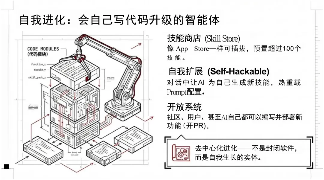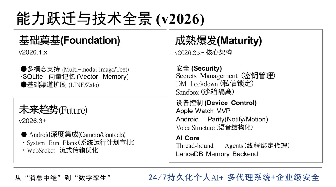 文档的一大特点是结构清晰、层次分明,从技术内核到外部生态,从个体进化到群体协同,层层递进。其核心观点在于:OpenClaw不仅是一个工具,更是一种“可进化的数字生命体”,具备自我编程、记忆持久化、跨设备协同等能力,推动AI从“对话”走向“行动”。