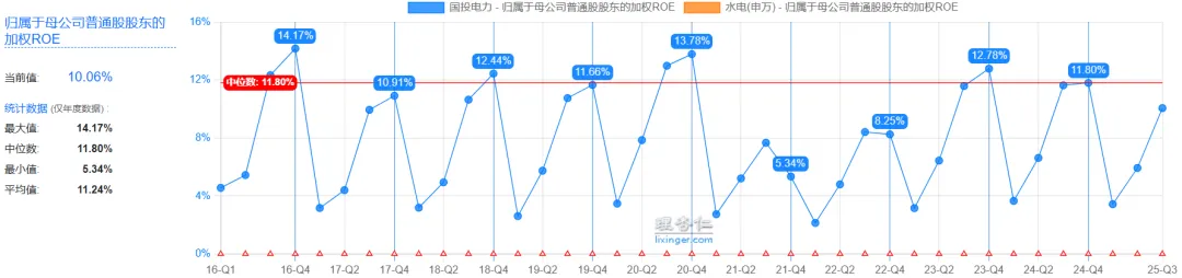 先看ROE,这是巴老爷子首先要看的,最好是连续七年要达到15%以上。国投电力目前最新的三季度ROE已经超过10%,最近十年的ROE中位数接近12%,这个指标仿佛还不够亮丽。但是国投电力作为水电企业,衡量其盈利能力不完全依靠ROE这个指标(主要是因为其水电运营过程要产生大量的资产折旧)。如下图(截图自理杏仁):
