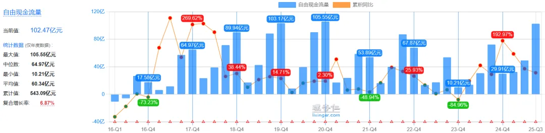 截止2025年三季度期末,公司的自由现金流超百亿,这还是除去资本开支后,我认为非常优秀,如下图(截图自理杏仁):